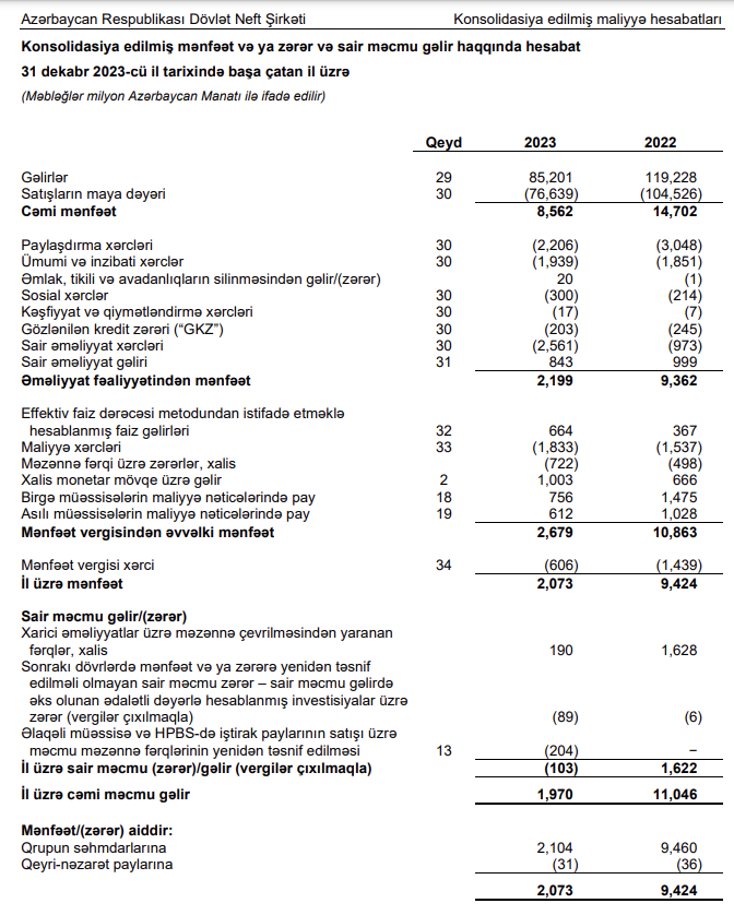 SOCAR 2023-cü ili 2 milyard 73 milyon manat xalis mənfəət ilə başa vurub. Şirkət 2022-ci ili 9 milyard 424 milyon manat xalis mənfəət ilə bağlamışdı. Beləliklə, ötən il Azərbaycanın iri şirkətinin xalis mənfəəti 7 milyard 351 milyon manat və ya 4,5 dəfə azalıb.