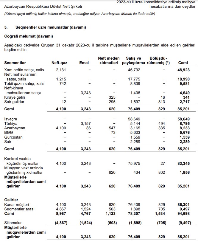 2023-cü ildə SOCAR-ın 85 milyard 201 milyon manat gəlirini hansı seqmentlər və ölkələrdə əldə etdiyi məlum olub.