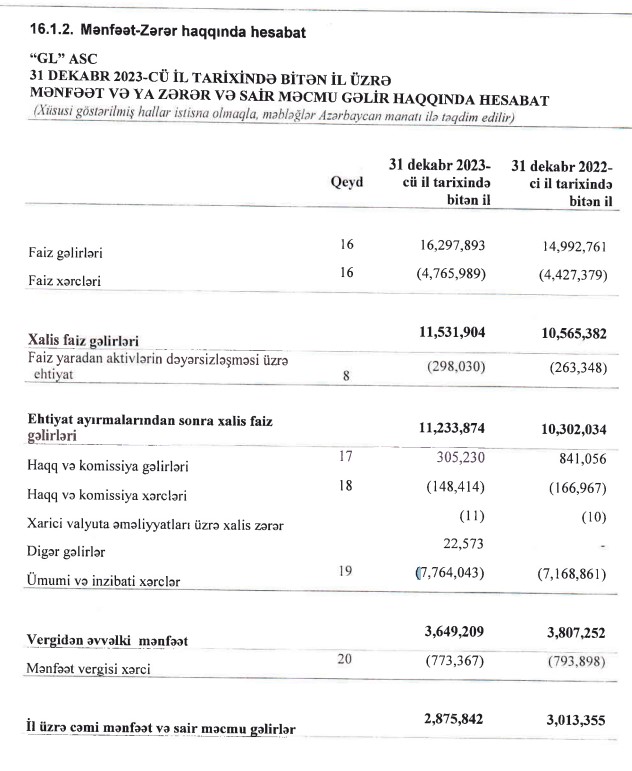 Marja.az xəbər verir ki, "GL" ASC-nin faiz gəlirləri 2022-ci ildə 14 milyon 993 min manat ikən, 2023-cü ildə 16 milyon 298 min manat təşkil edib (1 milyon 305 min manat və ya 8,7% artıb). Kredit şirkətinin haqq və komissiya gəlirləri isə 841 min manatdan 305 min manata düşüb (2,8 dəfə azalıb).