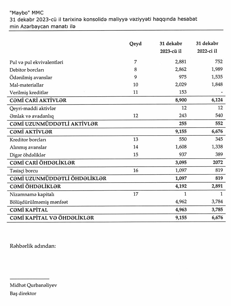 2023-cü ildə "Maybo" MMC-nin cəmi aktivləri 2 milyon 479 min manat və ya 37,1% artaraq 9 milyon 155 min manata çatıb.