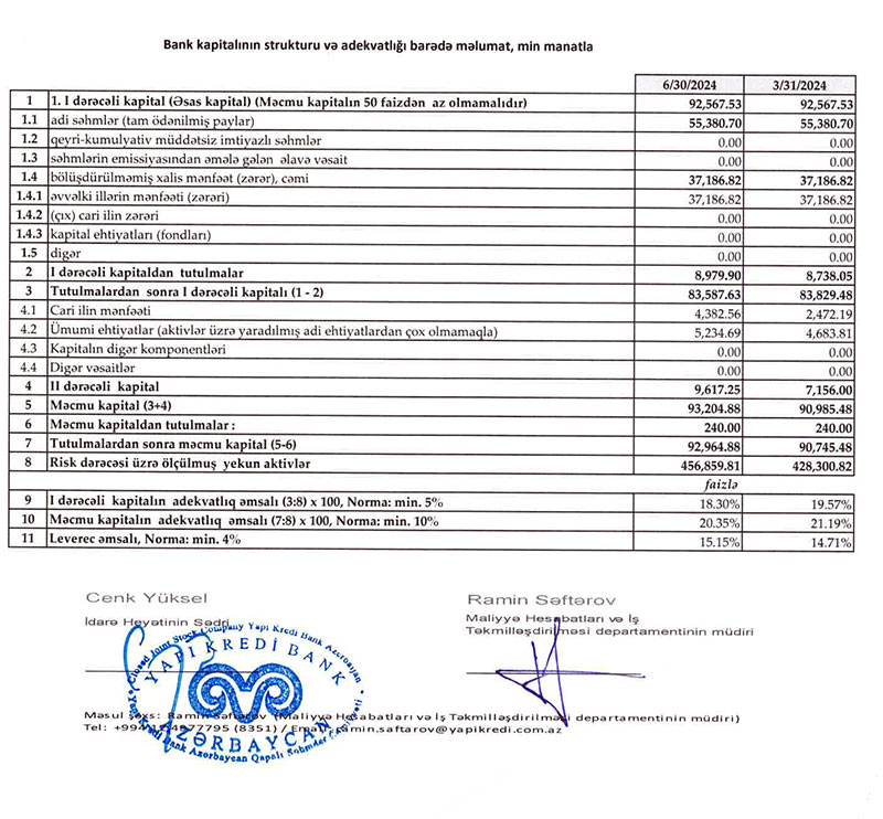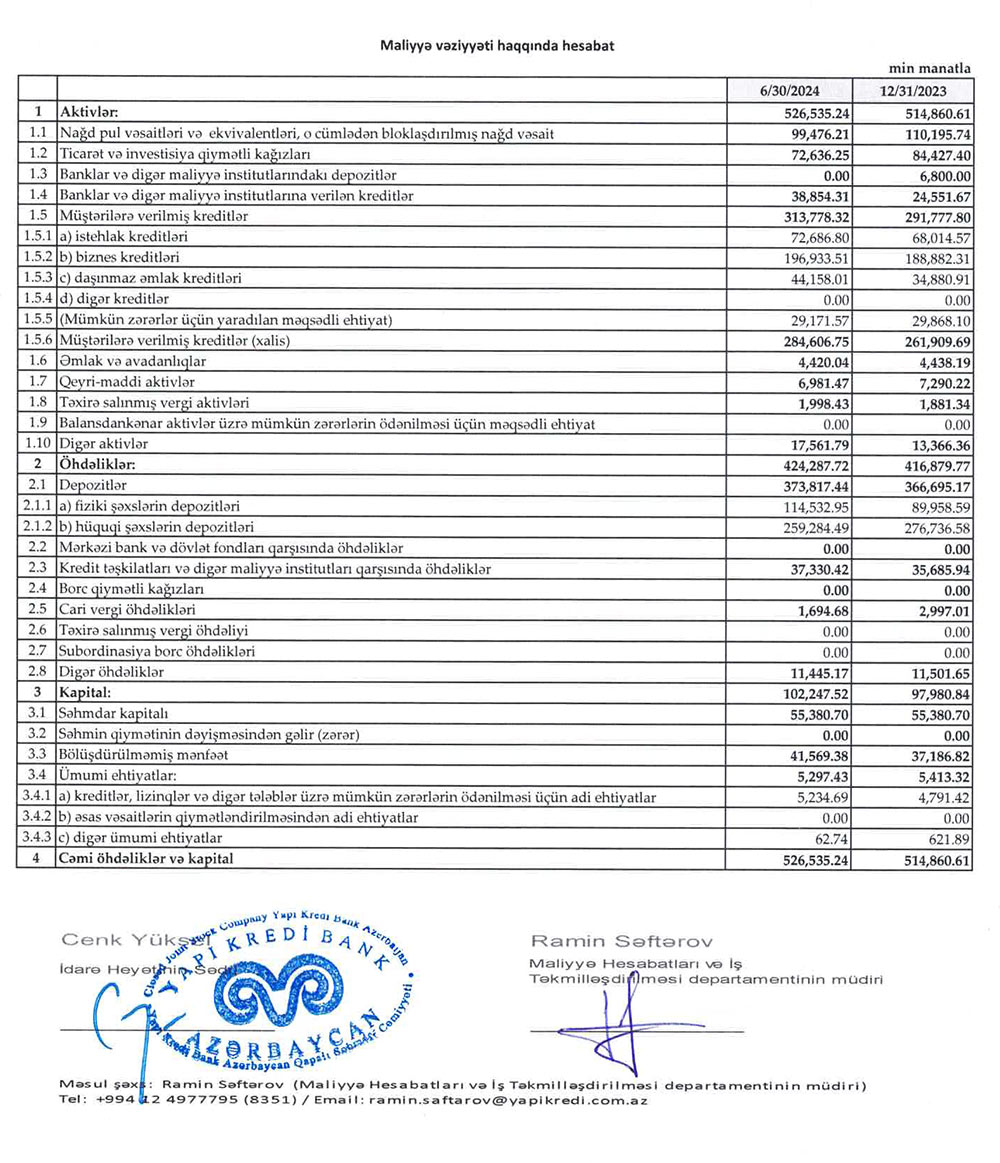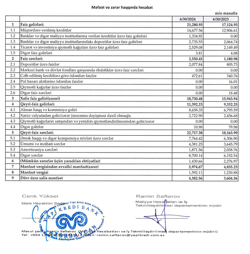 "Yapı Kredi Bank Azərbaycan" 2024-cü ilin yanvar-iyun dövründə əməliyyat mənfəətindən 1 milyon 431 min manat mümkün zərərlər üçün yaradılan ehtiyatlara ayrıb (2023-cü ilin eyni dövründə 2 milyon 277 min manat ayrılmışdı).