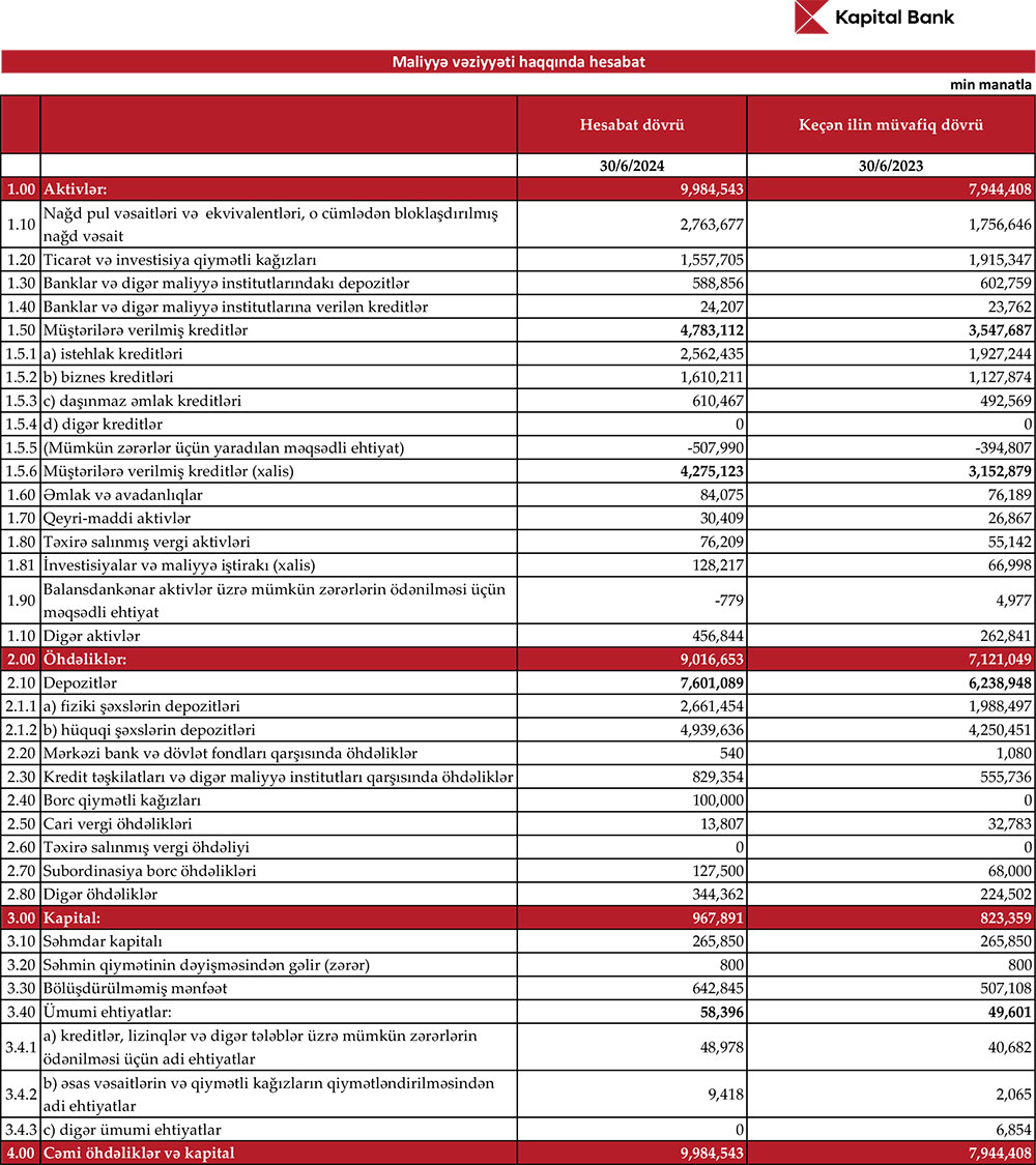 30 iyun 2023-cü il tarixi ilə müqayisədə "Kapital Bank"ın cəmi aktivləri 2 milyard 40 milyon 135 min manat və ya 25,7% artaraq 30 iyun 2024-cü il tarixində 9 milyard 984 milyon 543 min manata çatıb.