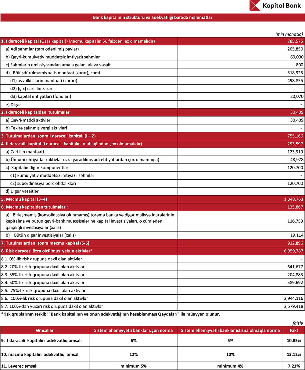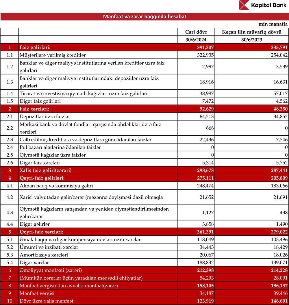 "Kapital Bank" ASC 2024-cü ilin ilk 6 ayını (yanvar-iyun) 123 milyon 919 min manat xalis mənfəət ilə başa vurub. "Kapital Bank"ın xalis mənfəəti cari ilin ilk yarısında ötən ilin eyni dövrü ilə müqayisədə 22 milyon 772 min manat və ya 15,5% azalıb. Bank 2023-cü ilin ilk 6 ayını 146 milyon 691 min manat xalis mənfəət ilə bağlamışdı. Xalis mənfəətin azalması əməliyyat xərclərinin və mümkün zərərlər üçün yaradılan məqsədli ehtiyatlara ayrılan vəsaitin artması ilə əlaqədardır.