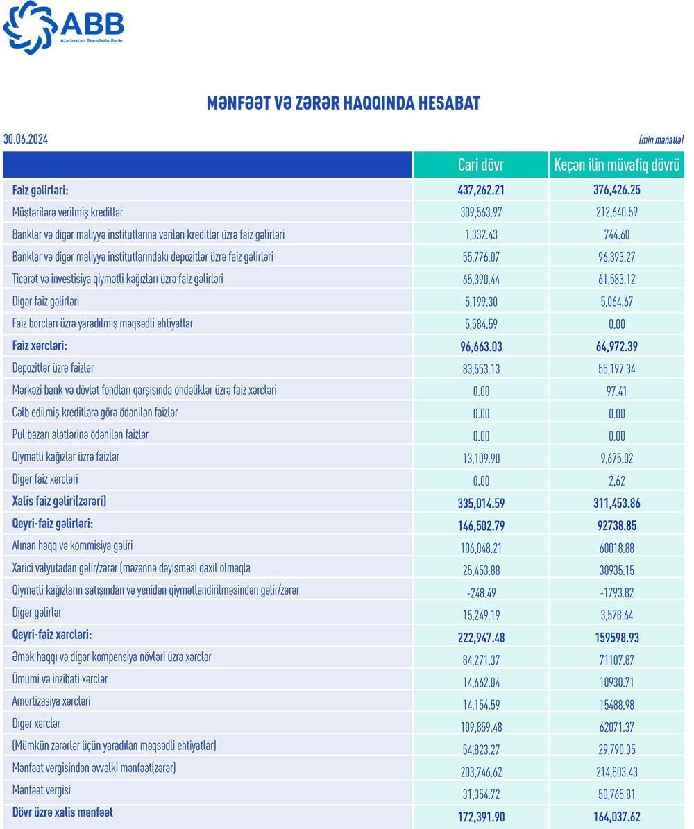 ABB-nin əməliyyat mənfəəti isə 258,60 milyon manat olub (2023-cü ilin II-ci rübündə 244.59 milyon manat təşkil etmişdi).