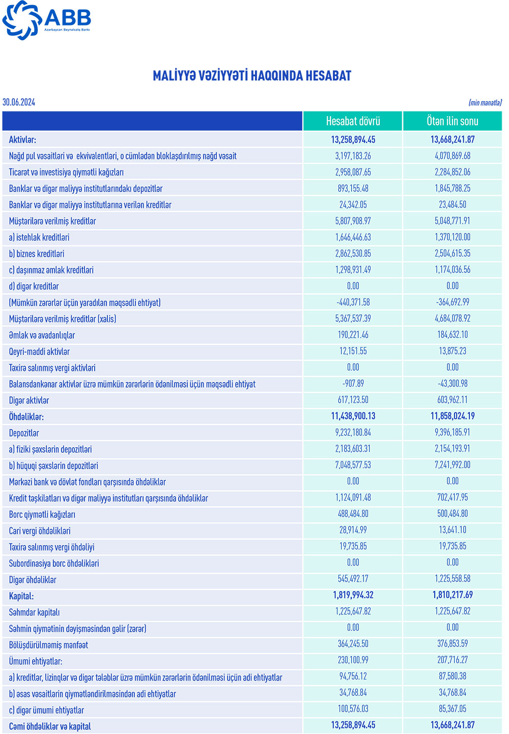 30 iyun 2024-cü il tarixinə ABB-nin cəmi aktivləri 13,26 milyard manat, öhdəlikləri isə 11,44 milyard manat təşkil edib.