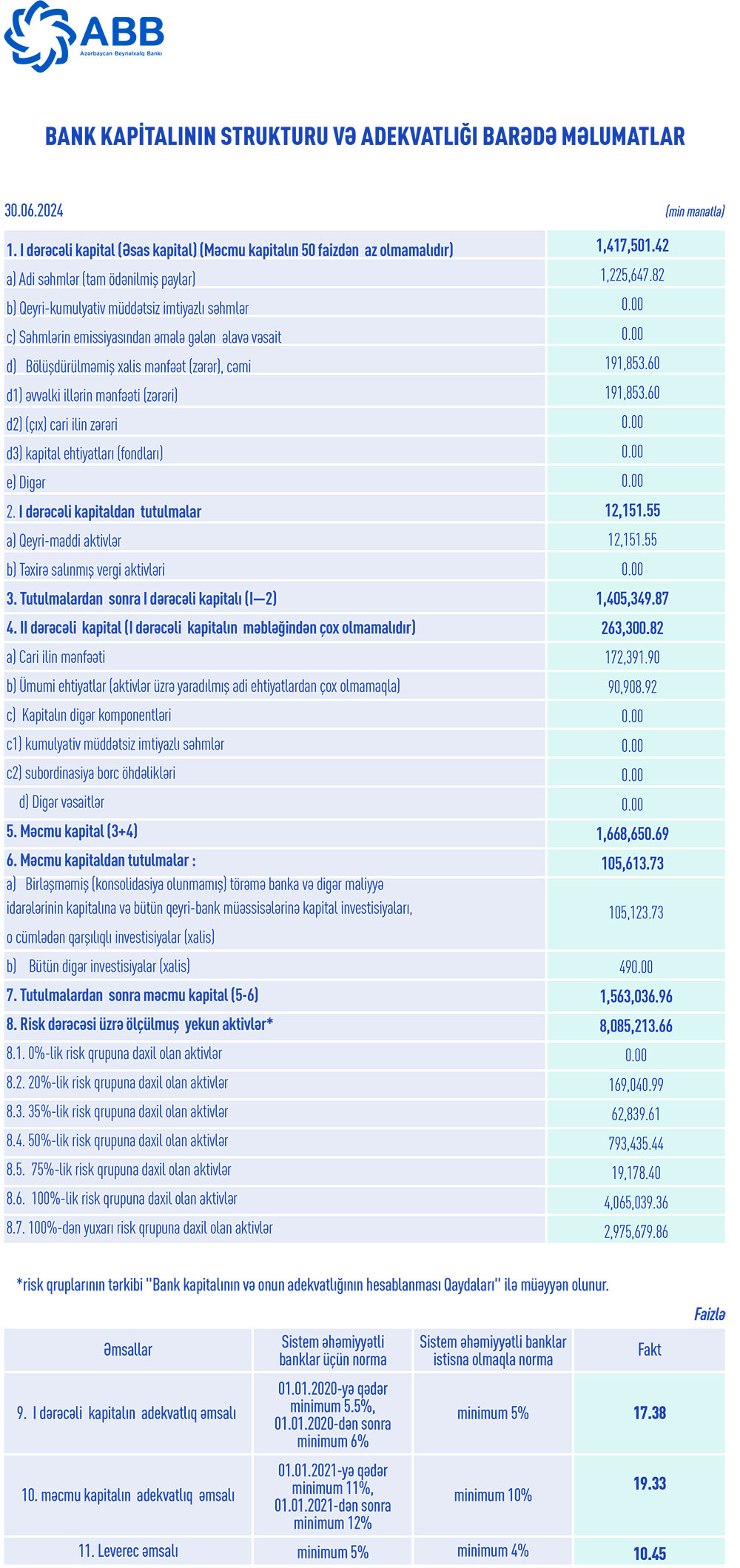 30 iyun 2024-cü il tarixində "ABB" ASC 1 milyard 563 milyon 037 min manat məcmu kapitala malik olub. İkinci rüb ərzində ABB-nin I dərəcəli kapitalının adekvatlıq əmsalı 17.38%, məcmu kapitalının adekvatlıq əmsalı 19.33% təşkil edib. Qeyd etmək lazımdır ki, bu göstəricilər tənzimləyici orqanın müəyyən etdiyi normalardan (müvafiq olaraq sistem əhəmiyyətli banklar üçün minimum 6% və 12%) əhəmiyyətli şəkildə yüksəkdir.