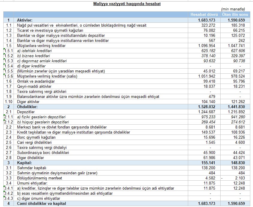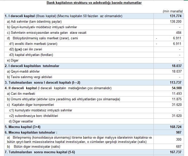 Dövr ərzində Bankın kapital mövqeyi xeyli güclənib. Hesabat dövründə Bankın məcmu kapitalı ötən ilin 2-ci rübü ilə müqayisədə 20 %-dən çox artaraq, 168 milyon manat olub. 2024-cü ilin ilk yarısında Bank kapital adekvatlığını yüksəldib. Belə ki, ilin ikinci rübünün sonuna bankın kapital adekvatlıq əmsalı artaraq, 12,8 %-i ötüb. Hesabat dövrünün sonuna bankın aktivləri də artaraq, 1 milyard 683 milyon manat olub.