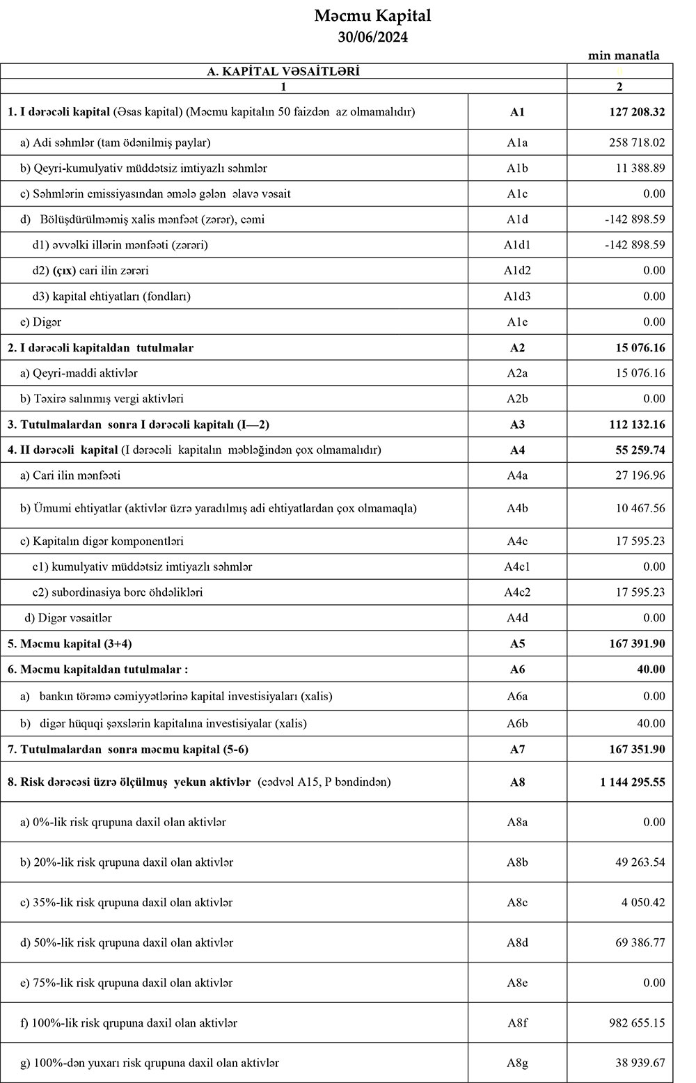 30 İyun 2024-cü il tarixində "AccessBank" 167 milyon 352 min manat məcmu kapitala malik olub.