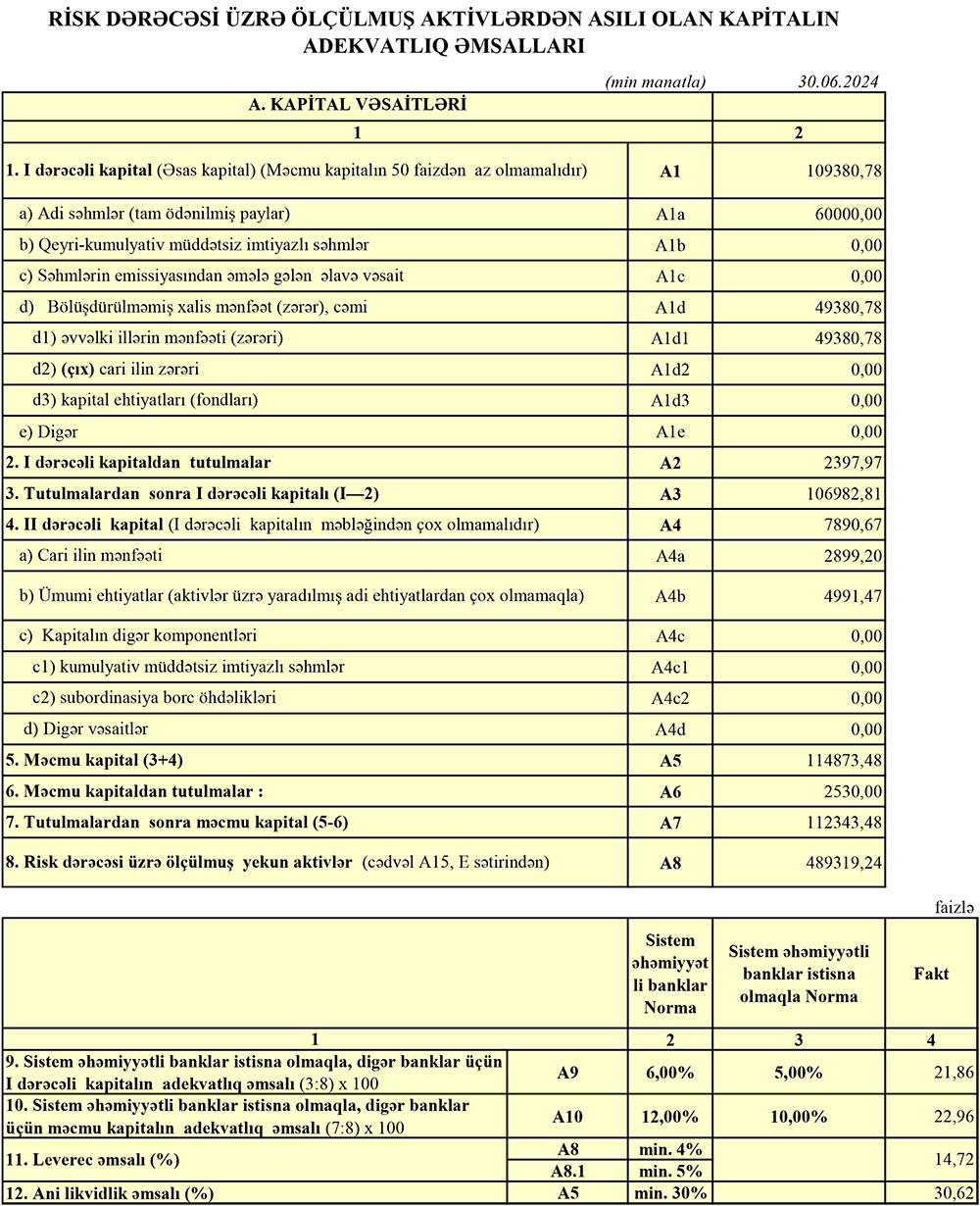 30 İyun 2024-cü il tarixində ASB 112 milyon 343 min manat məcmu kapitala malik olub. Bank ötən ilin sonunda 109 milyon 117 min manat məcmu kapitala malik idi.