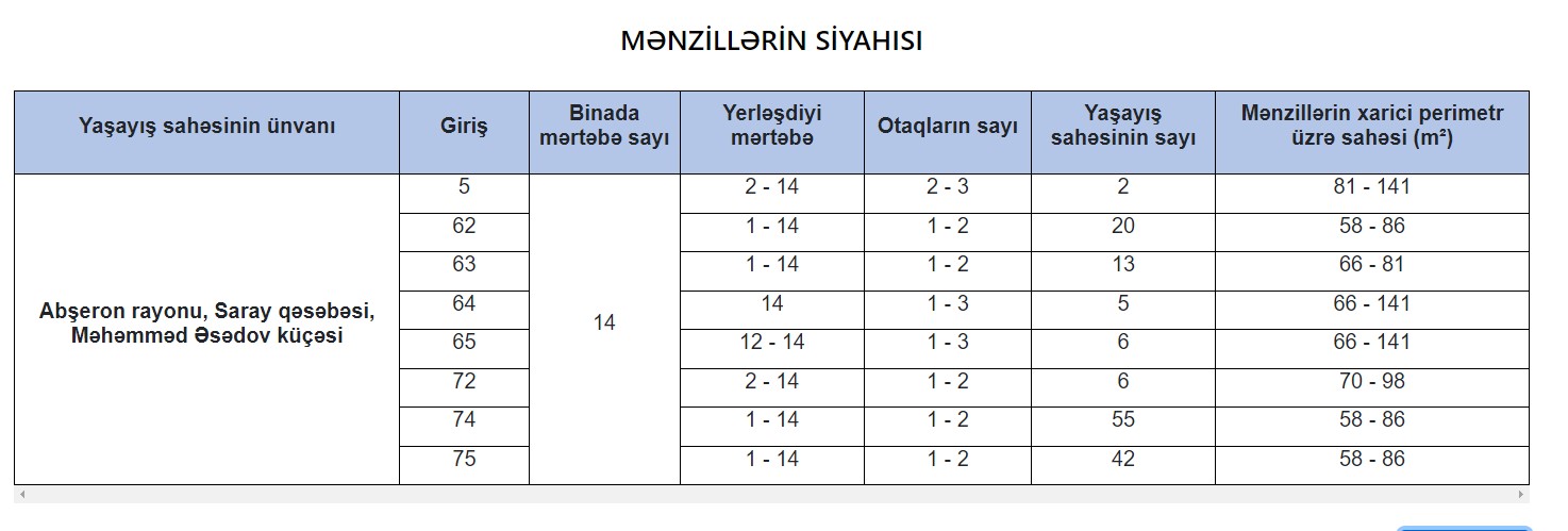 Yeni mənzillər seçim üçün 22 iyul 2024-cü ildən etibarən açıq olacaq. Vətəndaşlar təqdim olunan yaşayış sahələrinin siyahısı ilə aşağıdakı cədvəldə tanış ola bilərlər.