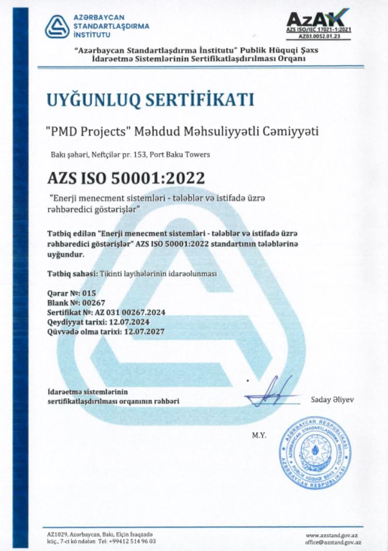 (®) Azərbaycanın aparıcı tikinti şirkəti olan PMD Projects ISO 50001 Enerji İdarəetmə Sistemi sertifikatını əldə edib. Ölkəmizdə ISO 50001 standartı 2022-ci ildə İqtisadiyyat Nazirliyi yanında Antiinhisar və İstehlak Bazarına Nəzarət Dövlət Xidmətinin tabeliyində olan Azərbaycan Standartlaşdırma İnstitutu tərəfindən qəbul edilib.