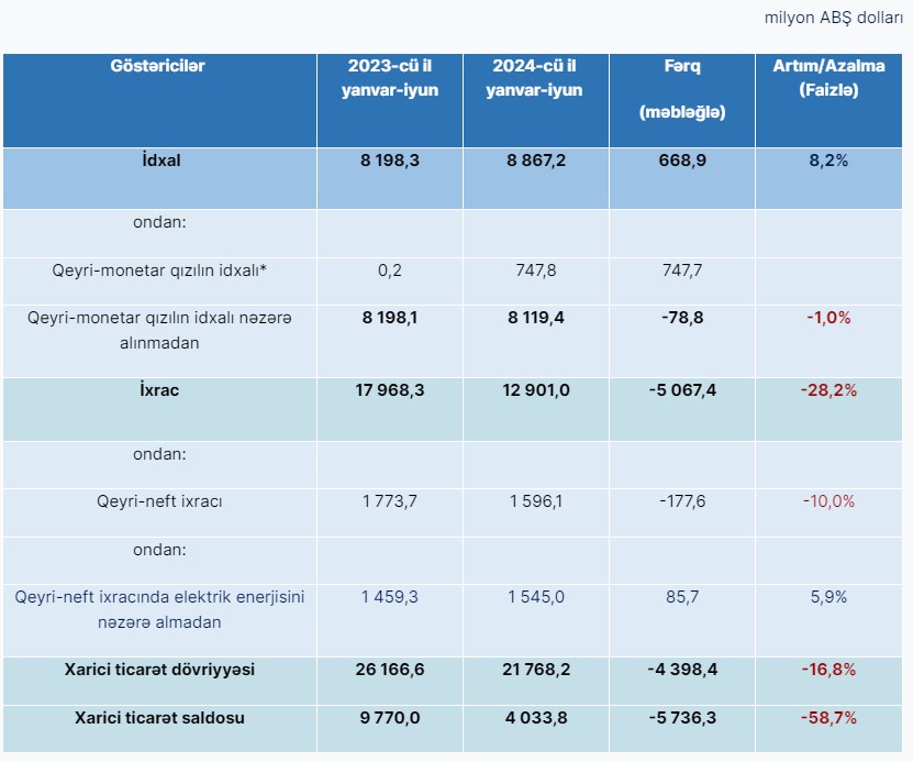 Dövlət Gömrük Komitəsinin yaydığı məlumata görə, 2024-cü ilin yanvar-iyun aylarında xarici ticarət dövriyyəsi 21 milyard 768,2 milyon ABŞ dolları təşkil etmişdir. Ticarət dövriyyəsinin 8 milyard 867,2 milyon ABŞ dollarını (* 747,8 milyon ABŞ dolları qeyri-monetar qızıl) və ya 40,7 faizini isə ölkəyə idxal olunmuş malların, 12 milyard 901 milyon ABŞ dollarını və ya 59,3 faizini ölkədən ixrac olunmuş malların dəyəri təşkil etmiş, nəticədə 4 milyard 33,8 milyon ABŞ dollar məbləğində müsbət saldo yaranmışdır.
