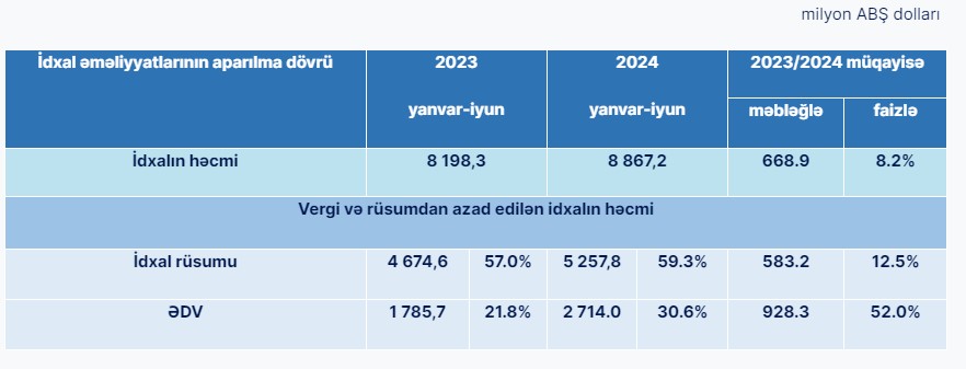 Qeyd edilib ki, ötən ilin müvafiq dövrü ilə müqayisədə 2024-cü ilin yanvar-iyun aylarında idxalın həcmi 668,9 milyon ABŞ dolları və ya 8,2 faiz artsa da, gömrük daxilolmaları kontekstində idxalın tərkib komponentində adekvatlıq müşahidə olunmur.