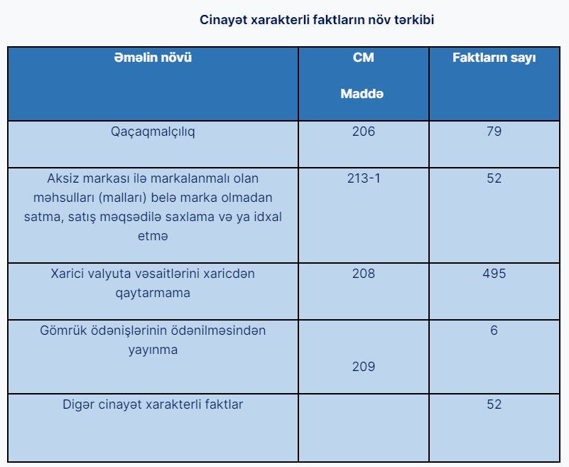 Gömrük orqanları tərəfindən 2024-cü ilin 1-ci yarımilində aşkar olunmuş cinayətləri törədən 682 nəfər (488 Azərbaycan vətəndaşı, 194 xarici) barəsində müvafiq tədbirlər görülmüş, 63 nəfər təqsirləndirilən şəxs qismində cəlb edilmiş, 18 nəfər barəsində məhkəmə tərəfindən həbs, 1 nəfəri barəsində ev dustaqlığı qətimkan tədbiri seçilmiş, istintaq orqanı tərəfindən 11 nəfər barəsində polisin nəzarəti altına vermə, 33 nəfər barəsində isə başqa yerə getməmə qətimkan tədbiri seçilmişdir.