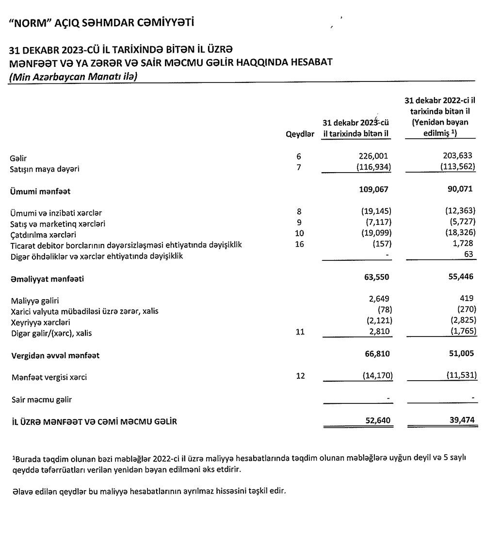 Belə ki, “Norm” ASC-də satış gəliri 11% artaraq 226 milyon manat təşkil edib, ümumi mənfəət isə 21,1% artaraq 109 milyon manata çatıb.
