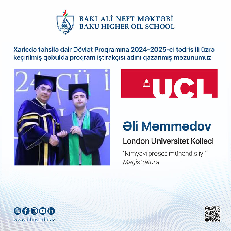 4. Əli Məmmədov - (2024-cü il məzunu) Britaniyanın London Universitet Kollecinin (UCL) Kimyəvi proses mühəndisliyi ixtisasında magistratura təhsili alacaq. 2019-cu ildə 655 balla BANM-in Kimya mühəndisliyi ixtisasına daxil olub. Tələbəlik illərində SOCAR-ın bir sıra müəssisə və zavodlarında istehsalat təcrübəsi keçib.