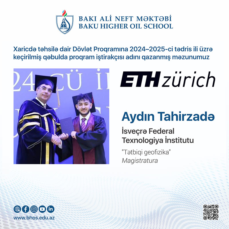 1. Aydın Tahirzadə - (2024-cü il məzunu) İsveçrə Federal Texnologiya İnstitutunun (ETH Sürix) Tətbiqi geofizika ixtisasında magistratura təhsili alacaq. “ETH Sürix” dünya reytinqində ilk 7-ci yerdə qərarlaşıb. Aydın 2019-cu ildə 653.5 balla BANM-ın Neft-qaz mühəndisliyi ixtisasına daxil olub.