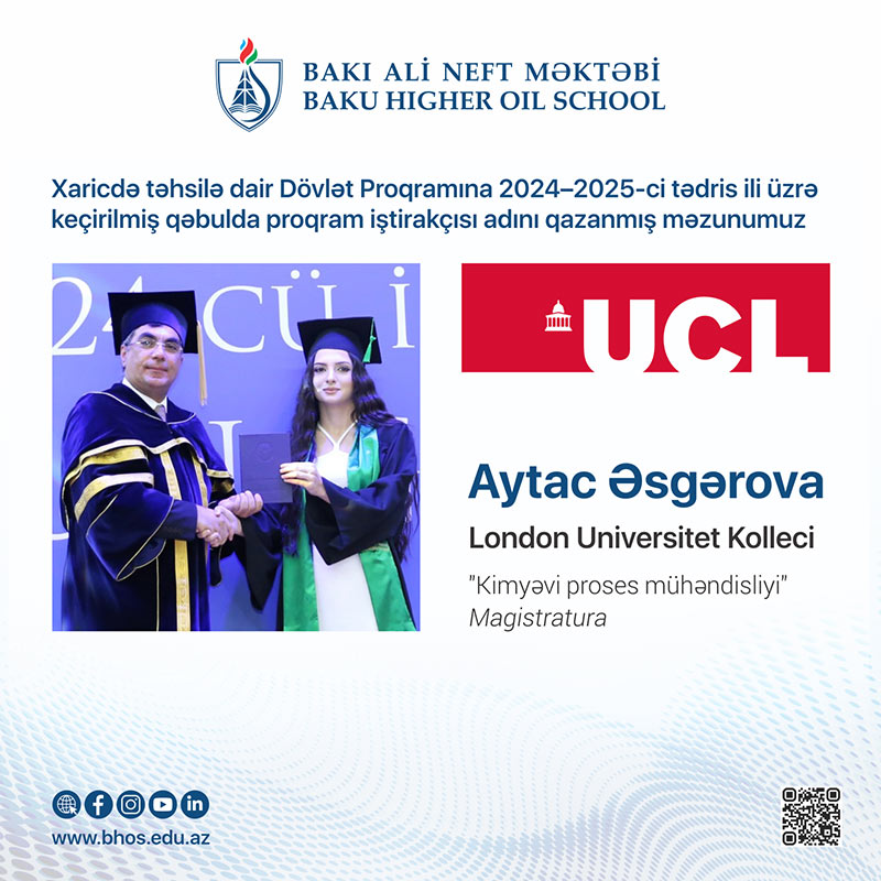 3. Aytac Əsgərova - (2024-cü il məzunu) Britaniyanın London Universitet Kollecinin (UCL) Kimyəvi proses mühəndisliyi ixtisasında magistratura təhsili alacaq. Aytac 2019-cu ildə 656.3 balla BANM-in Kimya mühəndisliyi ixtisasına daxil olub. Tələbəlik illərində IELTS imtahanından 8.5 , magistraturaya qəbul imtahanından isə 96 bal toplayaraq hər iki cəhd üzrə respublika birincisi olub.