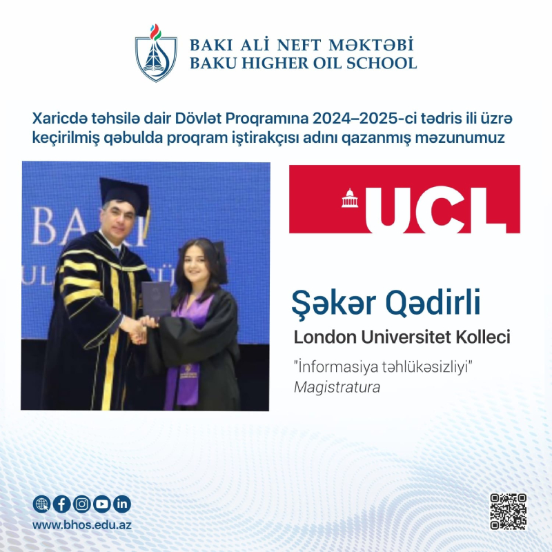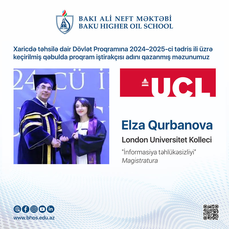 2. Elza Qurbanova - (2024-cü il məzunu) Britaniyanın London Universitet Kollecinin (UCL) İnformasiya təhlükəsizliyi ixtisasında magistratura təhsili alacaq. “UCL” dünya reytinqində ilk 9-cu yerdə qərarlaşıb. Elza 2019-cu ildə 688.6 balla BANM-ın İnformasiya təhlükəsizliyi ixtisasına daxil olub. Prezident təqaüdçüsü idi. Tələbəlik illərində “Kiber klub”un sədri olub. Bununla yanaşı, London İmperial Kolleci, “King's College London”, Şeffild Universiteti və Birminhem Universitetlərinə də qəbul alıb.