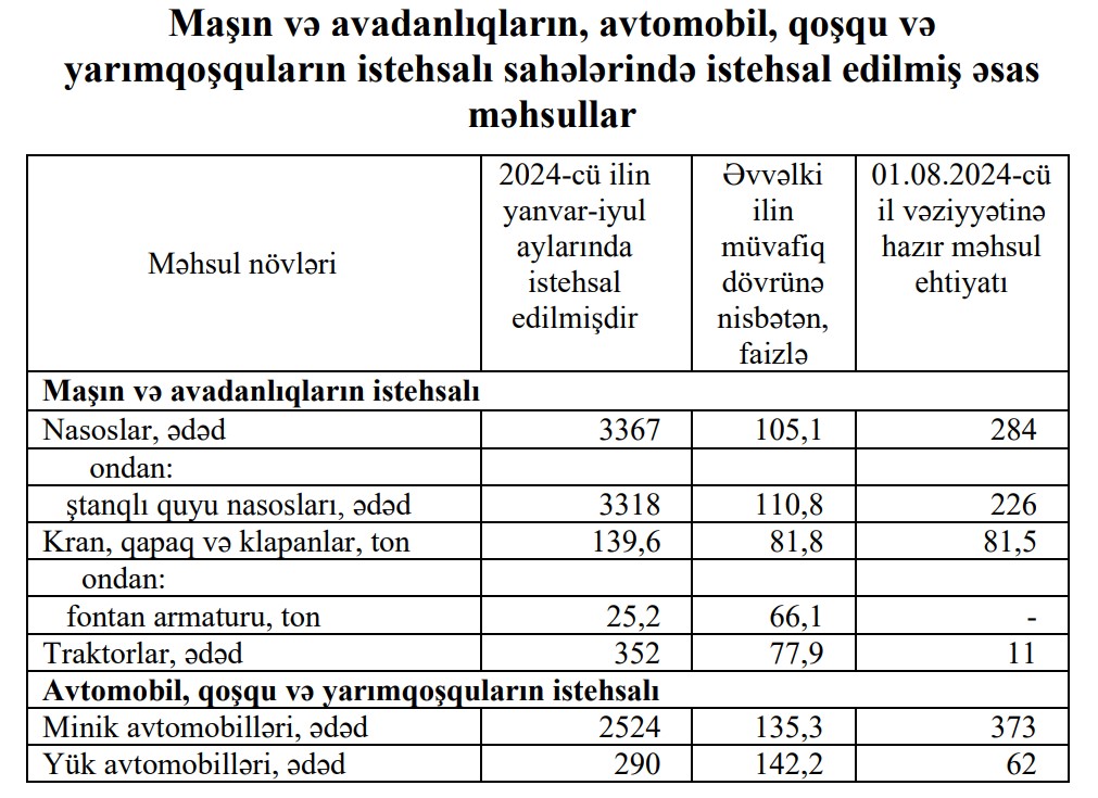 2024-сü ilin yanvar-iyul aylarında yük avtomobili istehsalı 42,2% artaraq 290 ədəd, traktor istehsalı isə 22,1% azalaraq 352 ədəd təşkil edib.