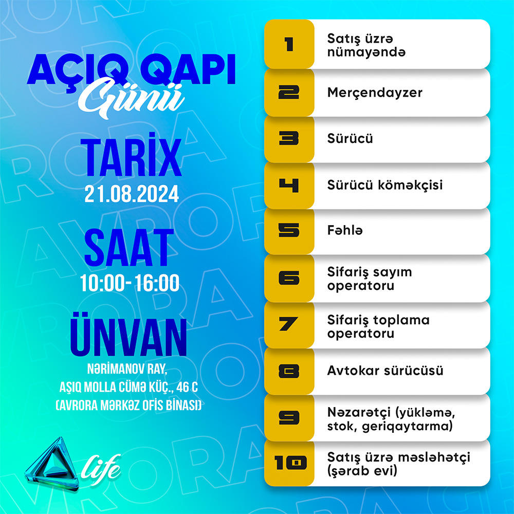 Şirkətin baş ofisində (Aşıq Molla Cümə 46C) keçiriləcək açıq qapı günü 21 avqust tarixində saat 10:00-dan etibarən başlayacaq və 16:00-a kimi davam edəcək. Açıq qapı günündə aşağıdakı vakansiyalar üzrə müraciətlər qəbul edilib, müsahibə təşkil ediləcəkdir: