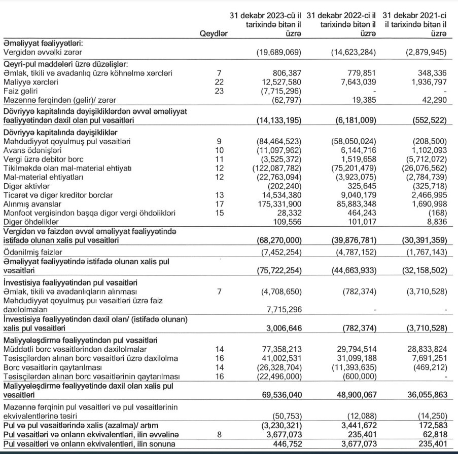 Marja.az Şirkətin başa çatmış son 3 maliyyə ili üzrə audit edilmiş maliyyə hesabatlarına istinadən xəbər verir ki, "Kristal Bakı" ASC 2021-ci ili 2 milyon 384 min manat, 2022-ci ili 11 milyon 972 min manat, 2023-cü ili 15 milyon 453 min manat xalis zərər ilə başa vurub. 31 dekabr 2023-cü il tarixində Şirkətin yığılmış zərəri 30 milyon 131 min manat təşkil edib. Şirkətin cəmi kapitalı mənfi 30 milyon 121 min manat olub.