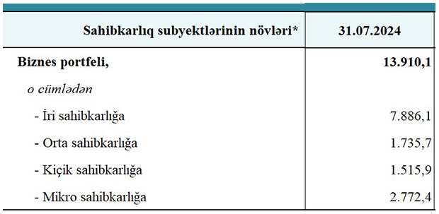 Cəmi biznes kreditləri portfelinin 9 milyard 621,8 milyon manatı və ya 69,2%-i iri və orta sahibkarlıq subyektlərinin, o cümlədən 1 milyard 735,7 milyon manatı və ya 12,5%-i orta sahibkarlıq subyektlərinin payına düşür.
