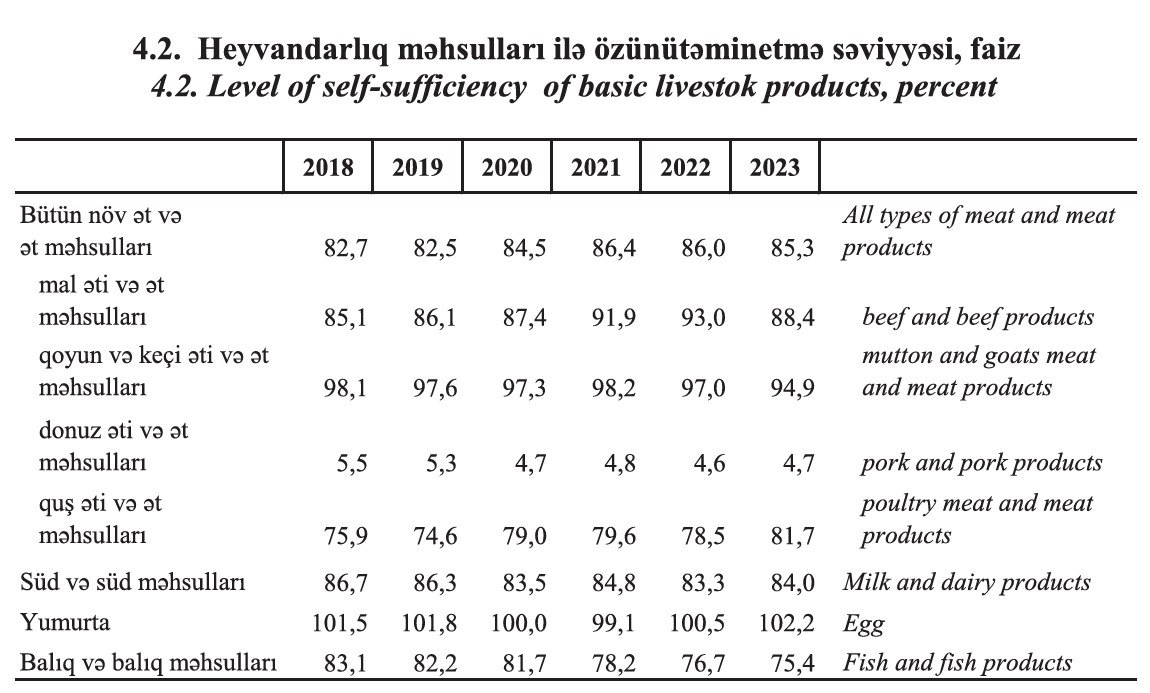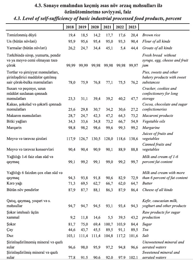 Məcmuədə özünütəminetmə səviyyəsi barədə məlumatlar da yer alıb. Belə ki, Azərbaycan hələ də yerli istehsal hesabına buğda, arpa, qarğıdalı, mal əti, qoyun əti, quş əti, bu ətlərdən hazırlanana məhsullar, süd və süd məhsulları, balıq və balıq məhsulları ilə özünü 100 faiz təmin edə bilmir.