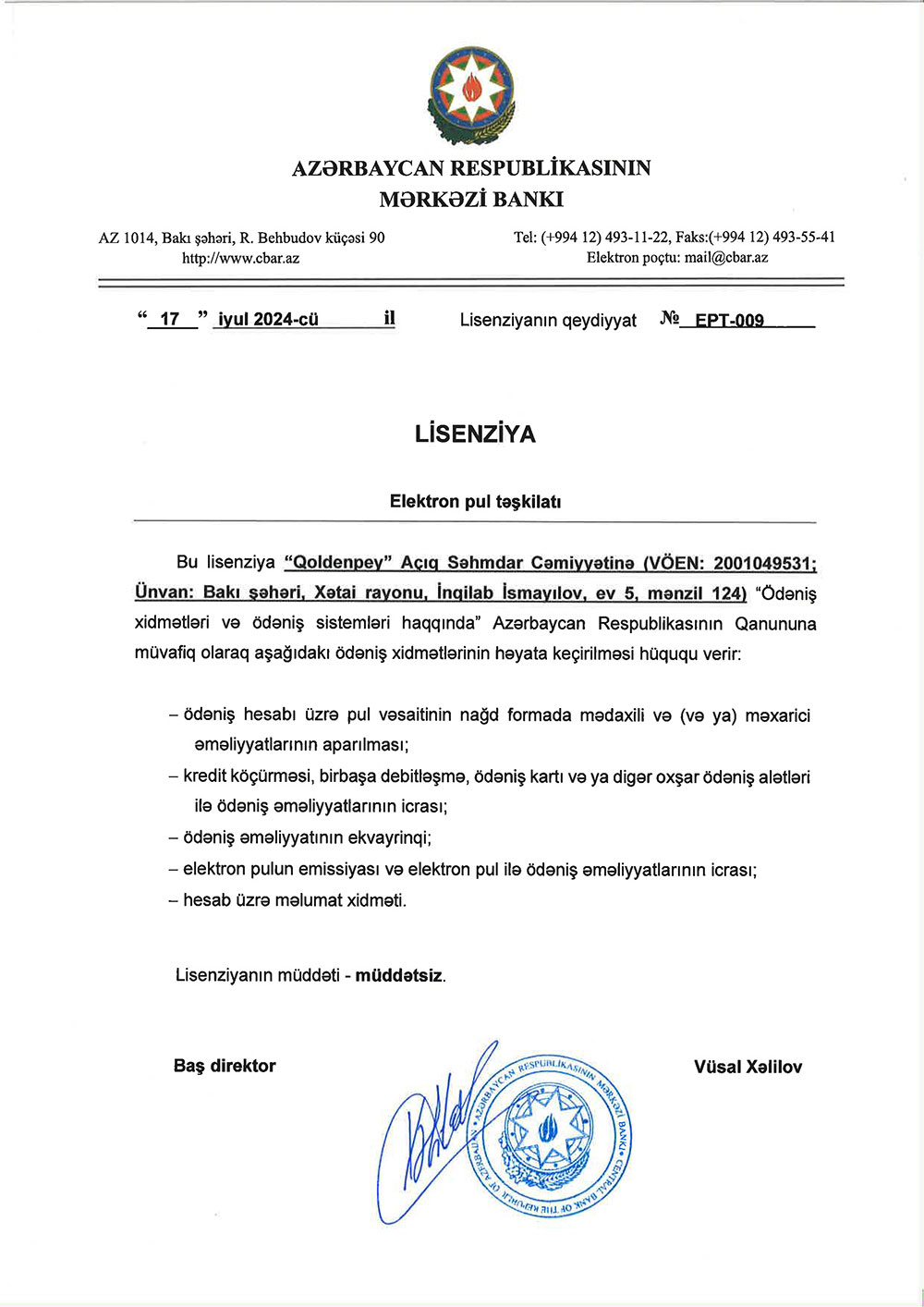 Şirkət Azərbaycan Respublikasının “Ödəniş xidmətləri və ödəniş sistemləri haqqında” Qanununa əsasən müddətsiz lisenziya almaq üçün Mərkəzi Banka müraciət etmişdir. Mərkəzi Bank tərəfindən şirkət fəaliyyətinin şəffaf qiymətləndirilməsi həyata keçirildikdən sonra 17 iyul 2024-cü il tarixində “Qoldenpey” ASC-yə müddətsiz lisenziya verilmişdir.