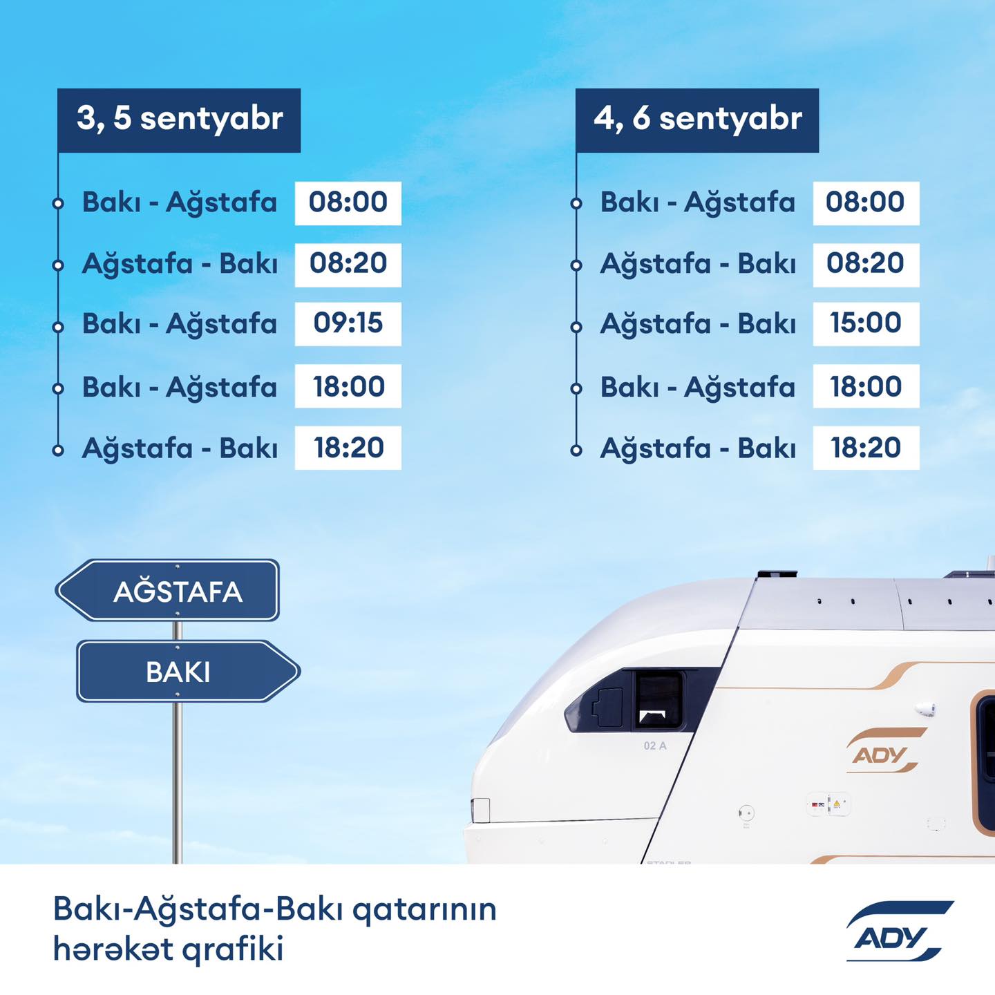 ADY sərnişin tələbatını təmin etmək məqsədilə 3, 4, 5 və 6 sentyabr tarixlərində Bakı-Ağstafa-Bakı marşrutu üzrə əlavə qatar reysləri təyin edir.