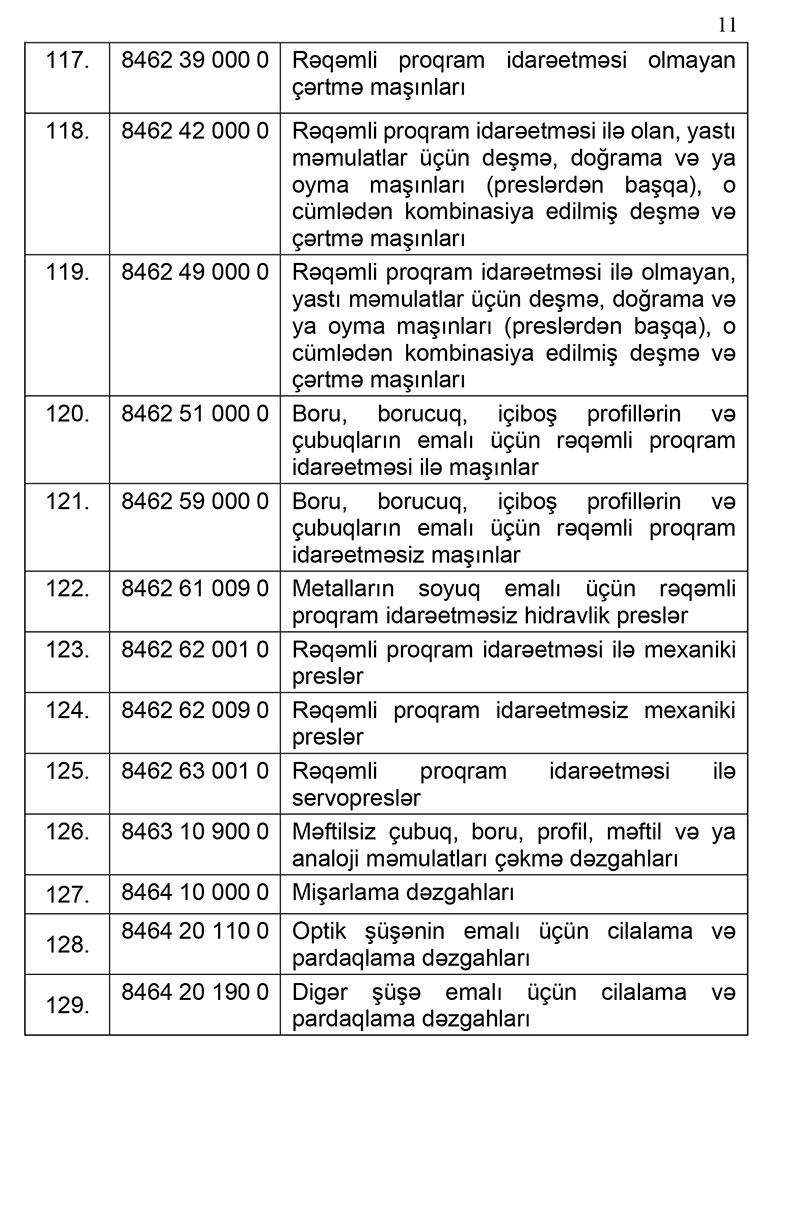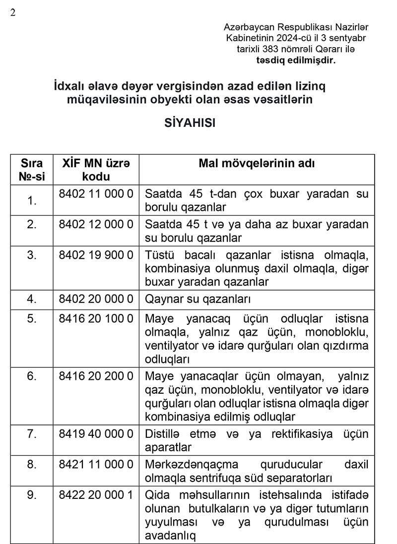 Qərara əsasən, siyahıya 136 lizinq müqaviləsinin obyekti olan əsas vəsaitin idxalı əlavə dəyər vergisindən azad edilib.