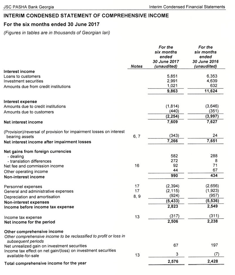 Bu ilin 6 ayında "PAŞA Bank Gürcüstan"ın faiz gəlirləri 9 milyon 863 min lari, qeyri-faiz gəlirləri 990 min lari təşkil edib. Bank 2016-cı ilin anoloji dövründə 11 milyon 624 min lari faiz, 434 min lari qeyri-faiz gəliri əldə etmişdi. Faiz gəlirlərinin aşağı düşməsinin səbəbi Bankın digər kedit təşkilatlarındakı depozitlərini və qiymətli kağızlara investisiyalarını azaltmasıdır.