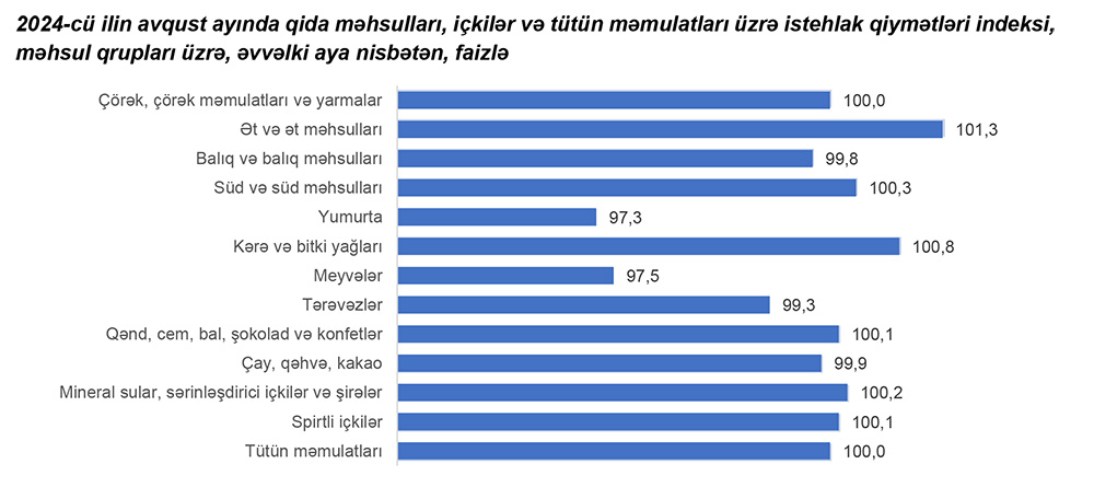 2024-cü ilin avqust ayında qida məhsulları, içkilər və tütün məmulatları üzrə istehlak qiymətləri indeksi əvvəlki aya nisbətən dəyişməyib, yanvar-avqust aylarında isə əvvəlki ilin müvafiq dövrünə nisbətən 0,1 faiz artıb.