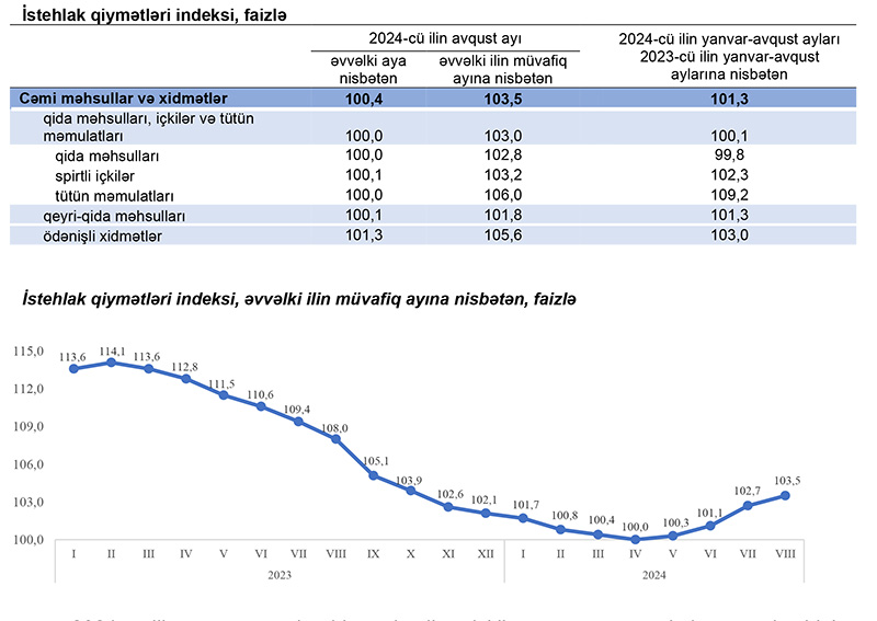 2024-cü ilin avqust ayında istehlak qiymətləri indeksi əvvəlki aya nisbətən 0,4 faiz, yanvar-avqust aylarında isə əvvəlki ilin müvafiq dövrünə nisbətən 1,3 faiz yüksəlib.