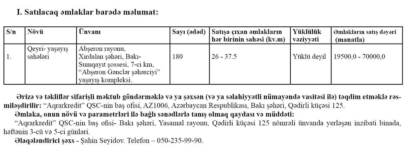 “Aqrarkredit” QSC Abşeron rayonu, Xırdalan şəhəri, Bakı-Sumqayıt şossesL, 7-ci km, “Abşeron Gənclər şəhərciyi” yaşayış kompleksində yerləşən bir sıra əmlaklarını satışa çıxarılıb.
