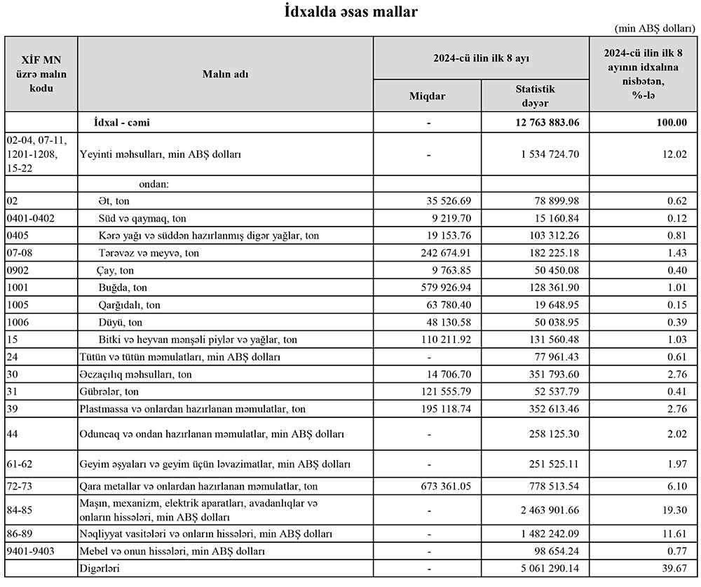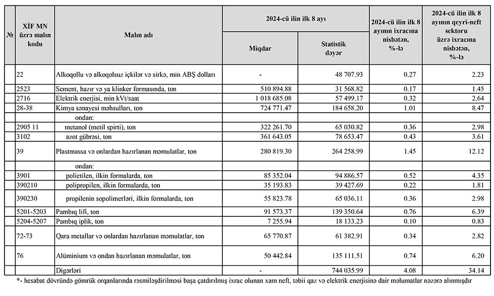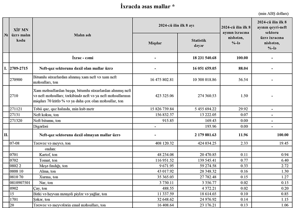 2024-cü ilin yanvar-avqust dövründə Azərbaycanın ən çox ixrac və idxal etdiyi mallar.