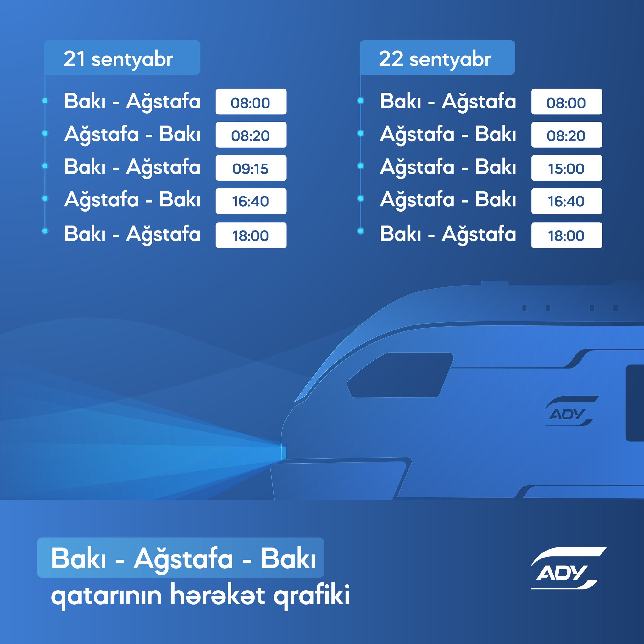 Azərbaycan Dəmir Yolları (ADY) sərnişin tələbatını təmin etmək məqsədilə 21 və 22 sentyabr tarixlərində Bakı-Ağstafa-Bakı marşrutu üzrə əlavə qatar reysləri təyin edir.