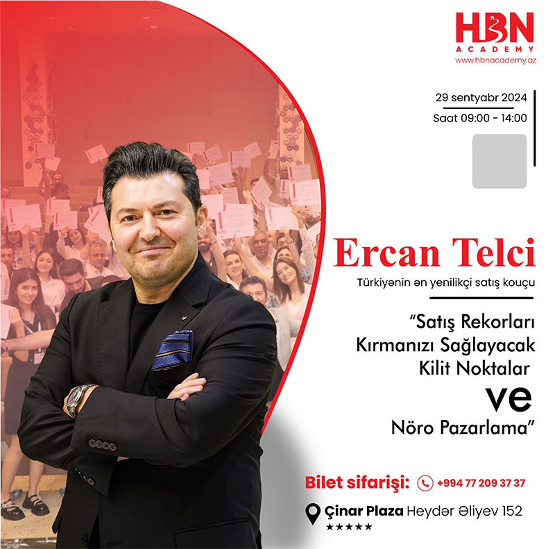29 sentyabr 2024-cü il tarixində, Bakıda “HBN Academy”nin təşkilatçılığı ilə tanınmış təlimçi Ercan Telci tərəfindən “Satış rekordlarını qırmaq üçün kilid nöqtələr və Neyro Marketinq” mövzusunda unikal bir təlim keçiriləcəkdir.