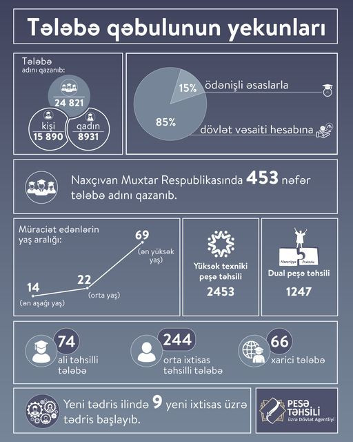 Müraciət edənlərin orta yaşı 22, ən aşağı yaş 14, ən yüksək yaş isə 69 olub. Dual peşə təhsili proqramı üzrə 1247 nəfər, yüksək texniki peşə təhsili səviyyəsi üzrə isə 2453 nəfər qəbul olunub. Həmçinin, 74 nəfər ali təhsilli, 244 nəfər orta ixtisas təhsilli şəxs, 66 nəfər xarici vətəndaş peşə təhsili müəssisələrinə qəbul olunub.