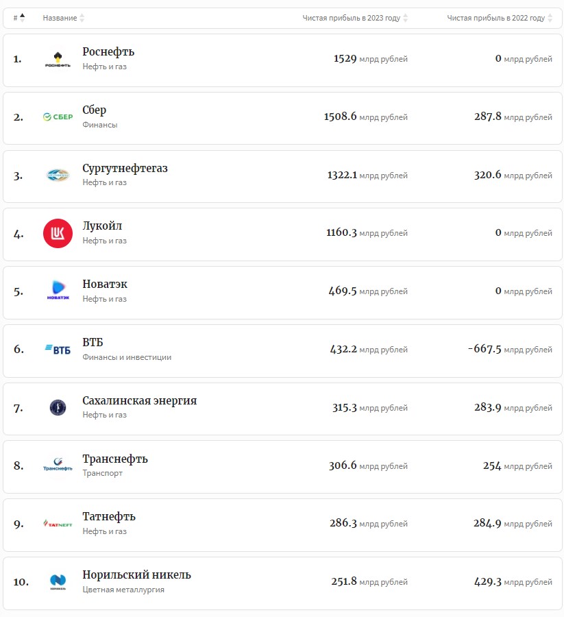 100 reytinq iştirakçısının ümumi mənfəəti 13,2 trilyon rublu ötüb. 2022-ci ildə ümumi mənfəət 9,27 trilyon rubl olmuşdu.