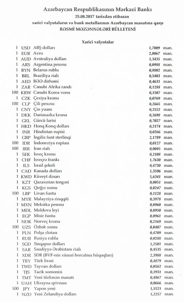 Avqustun 24-də rəsmi olaraq 1 dollar 1,7009 manata, 1 avro isə 2.0075 manata bərabər idi.