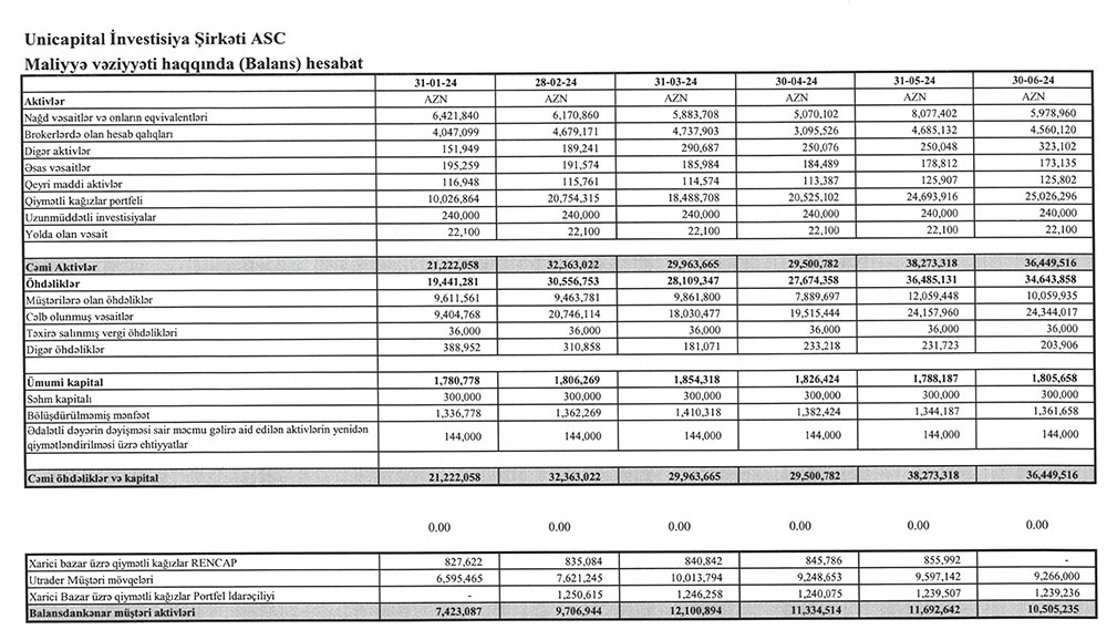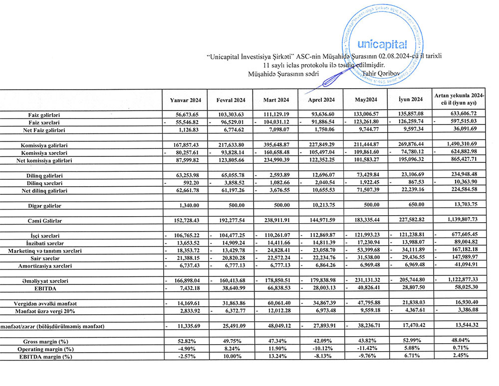 İnvestisiya xidmətləri göstərən "Unicapital İnvestisiya Şirkəti" ASC 2024-cü ilin ilk 6 ayını (yanvar-iyun) 13 min 544 manat xalis mənfəət ilə başa vurub.
