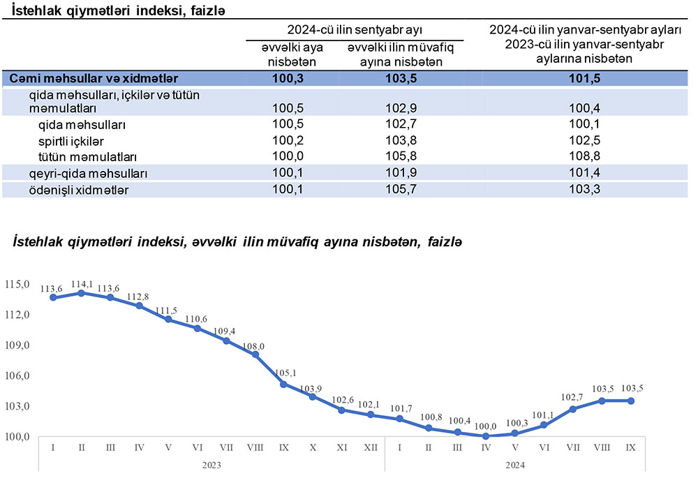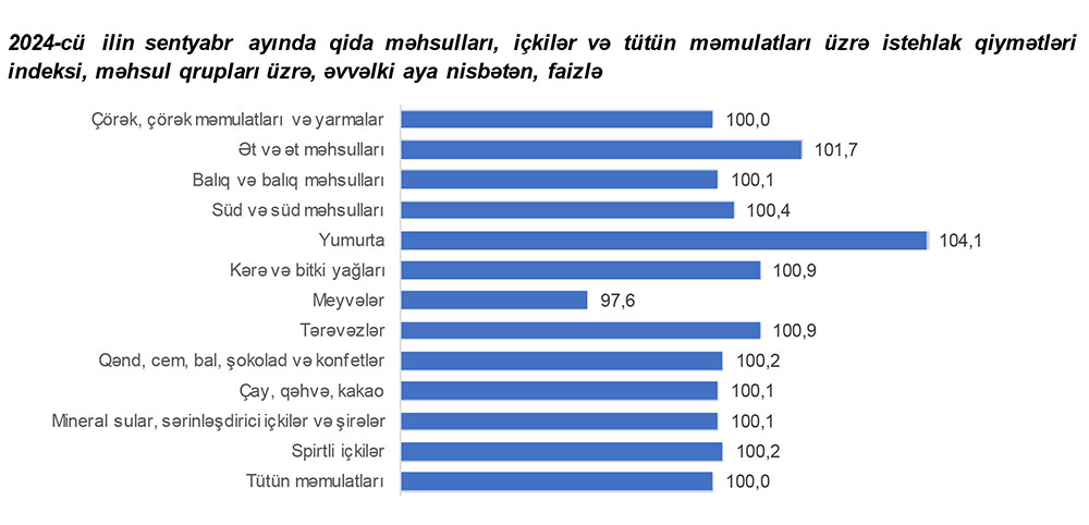 2024-cü ilin sentyabr ayında qida məhsulları, içkilər və tütün məmulatları üzrə istehlak qiymətləri indeksi əvvəlki aya nisbətən 0,5 faiz, yanvar-sentyabr aylarında isə əvvəlki ilin müvafiq dövrünə nisbətən 0,4 faiz artıb.