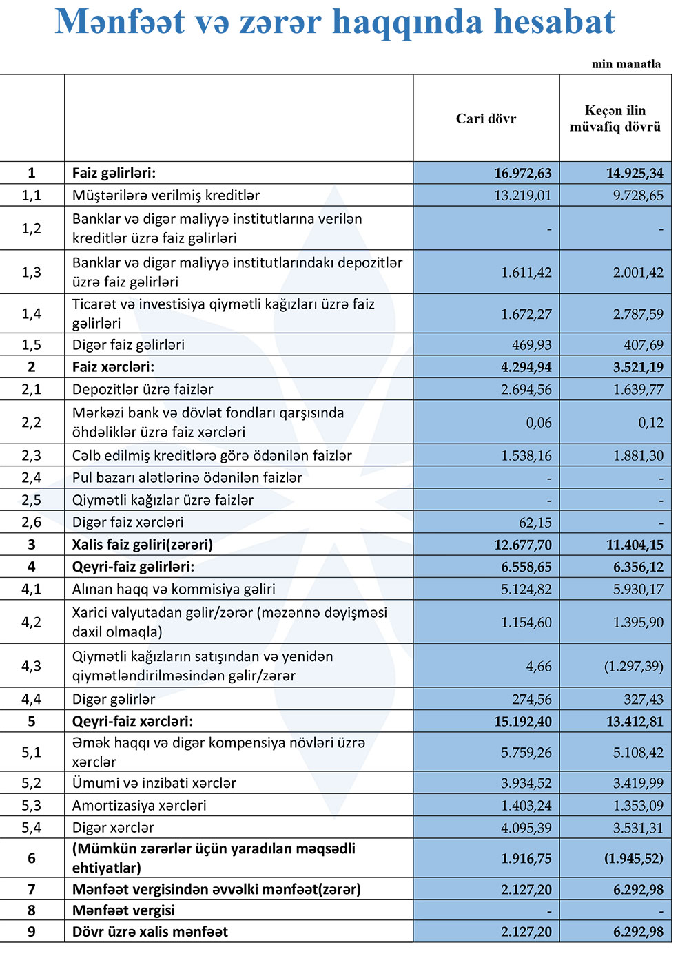 Müqayisə üçün qeyd edək ki, 2023-cü ilin 9 ayı ərzində "AFB Bank"ın cəmi əməliyyat gəlirləri 21 milyon 281 min manat, cəmi əməliyyat xərcləri 16 milyon 934 min manat, əməliyyat mənfəəti 4 milyon 347 min manat təşkil etmişdi. Həmçinin mümkün zərərlər üçün yaradılan məqsədli ehtiyatlardan azad olmuş 1 milyon 945 min manat mənfəətə əlavə olumuşdu. Bu səbəbdən Bankın xalis mənfəəti daha yüksək olmuşdu.
