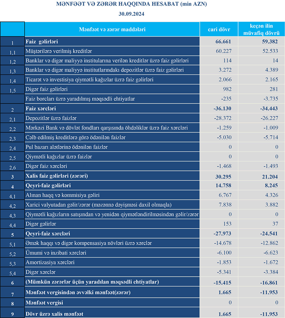 Müqayisə üçün qeyd edək ki, 2023-cü ilin 9 ayı ərzində "Turan Bank"ın cəmi əməliyyat gəlirləri 67 milyon 627 min manat, cəmi əməliyyat xərcləri 62 milyon 719 min manat, əməliyyat mənfəəti 4 milyon 908 min manat təşkil etmişdi. Bank əməliyyat mənfəətindən 16 milyon 861 min manat mümkün zərərlər üçün yaradılan məqsədli ehtiyata ayırmışdı.