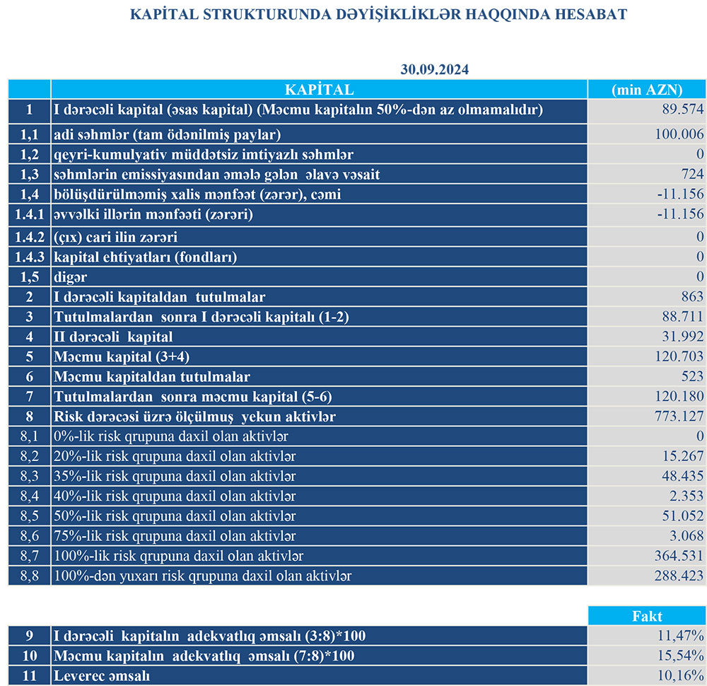 30 sentyabr 2024-cü il tarixində "Turan Bank" ASC 120 milyon 180 min manat məcmu kapitala malik olub.