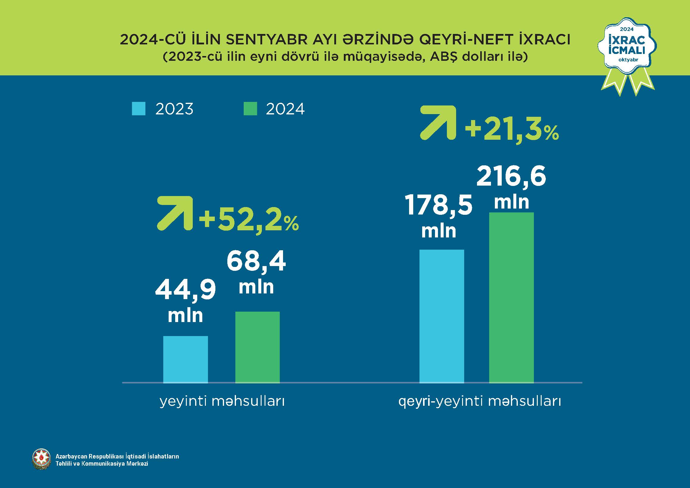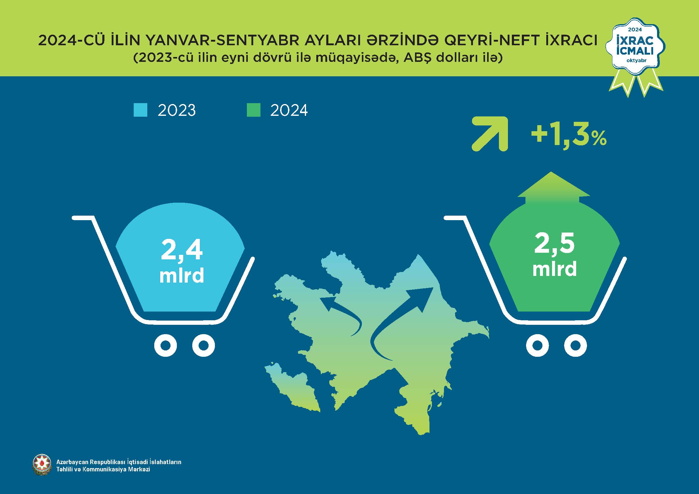 İcmala əsasən, 2024-cü ilin yanvar-sentyabr ayları ərzində Azərbaycanın qeyri-neft sektoru üzrə ixrac həcmi 2023-cü ilin müvafiq dövrü ilə müqayisədə 1,3% artaraq 2,5 milyard ABŞ dolları təşkil edib.