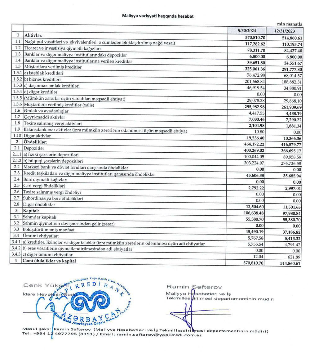 "Yapı Kredi Bank Azərbaycan" QSC 2024-cü ilin 9 ayını (yanvar-sentyabr) 8.3 milyon manat xalis mənfəətlə başa vurub.