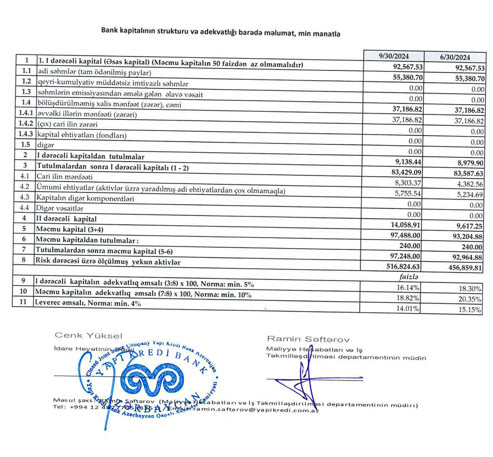 "Yapı Kredi Bank Azərbaycan" cari ilin üçüncü rübündə Azərbaycan Respublikası Mərkəzi Bank tərəfindən müəyyən olunmuş prudensial normativləri lazımı səviyyədə yerinə yetirmişdir. Belə ki, bankın I dərəcəli kapitalının adekvatlıq əmsalı 16.14%, məcmu kapitalının adekvatlıq əmsalı isə 18.82% olmuşdur. Bankın tutulmalardan sonra məcmu kapitalı 97 milyon manat təşkil edib. Qeyd edək ki, mövcud qanunvericiliyə əsasən minimum məcmu kapital norması 50 milyon manatdır.