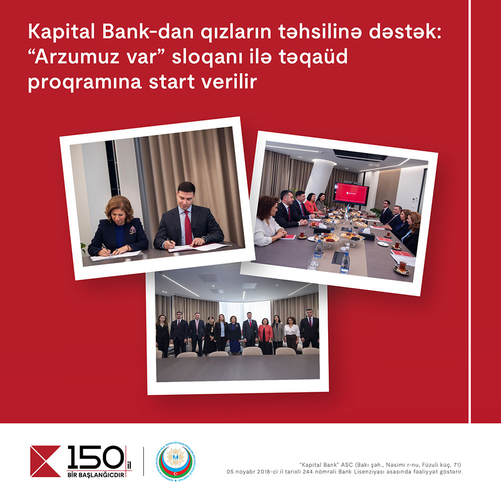 Qızların təhsil imkanlarının artırılması, onların cəmiyyətdə sosial aktivliyinin gücləndirilməsi və gələcək inkişaflarına dəstək məqsədi daşıyan memorandumu Kapital Bank-ın İdarə Heyətinin sədri, Baş İcraçı direktor Fərid Hüseynov və Azərbaycan Respublikasının Ailə, Qadın və Uşaq Problemləri üzrə Dövlət Komitəsinin sədri Bahar Muradova imzalayıb.